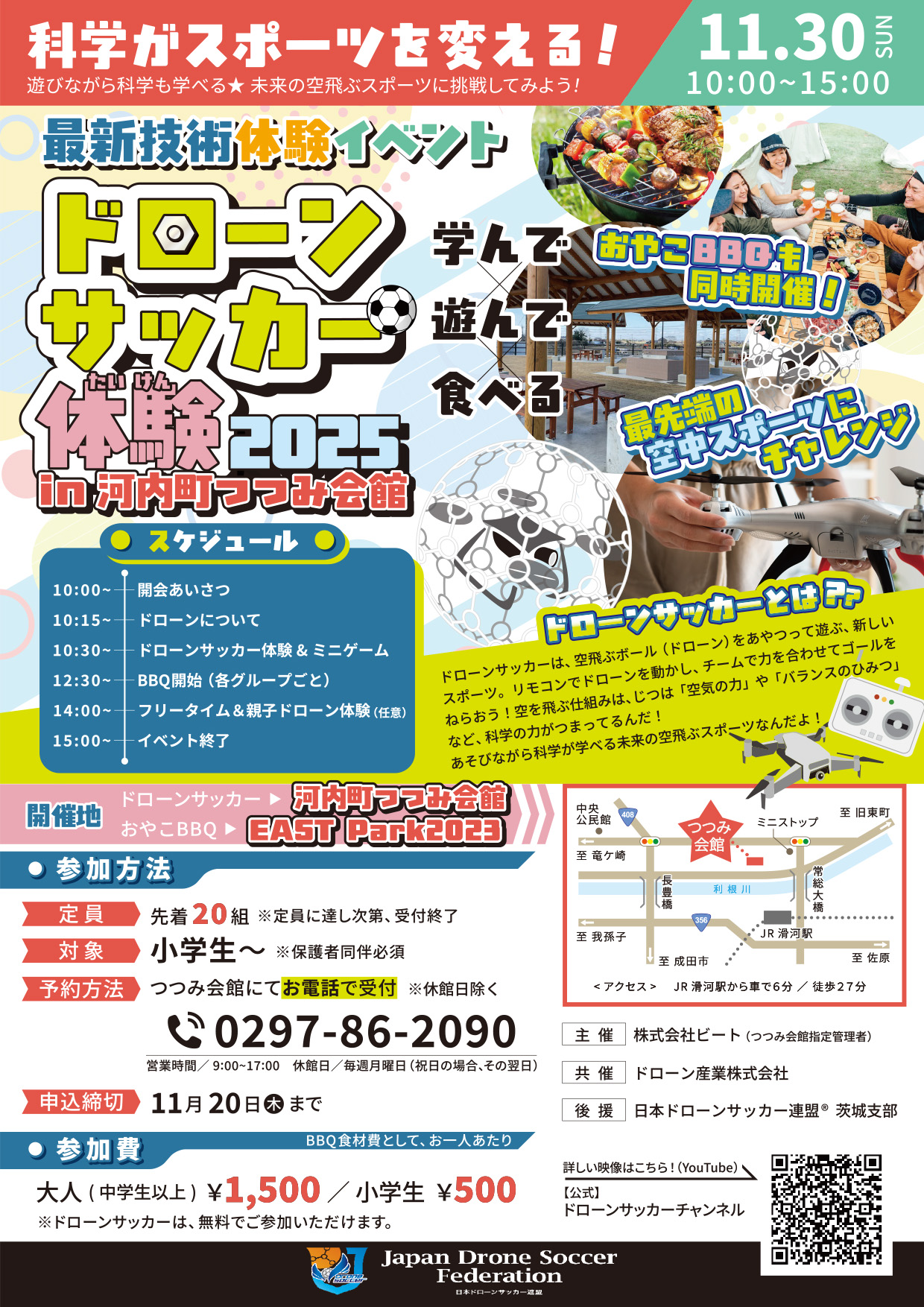 2025年11月30日(日)茨城県稲敷郡河内町つつみ会館にて開催される「ドローンサッカー体験2025 in 河内町つつみ会館」のご案内です。